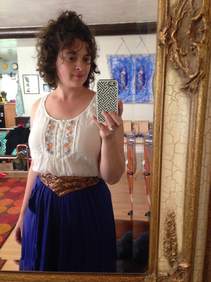 Karen didn’t find much on our visit — just a Merona denim-colored skirt. But I found two Columbia brand skirts — with pockets — and an unusual sequined belt.