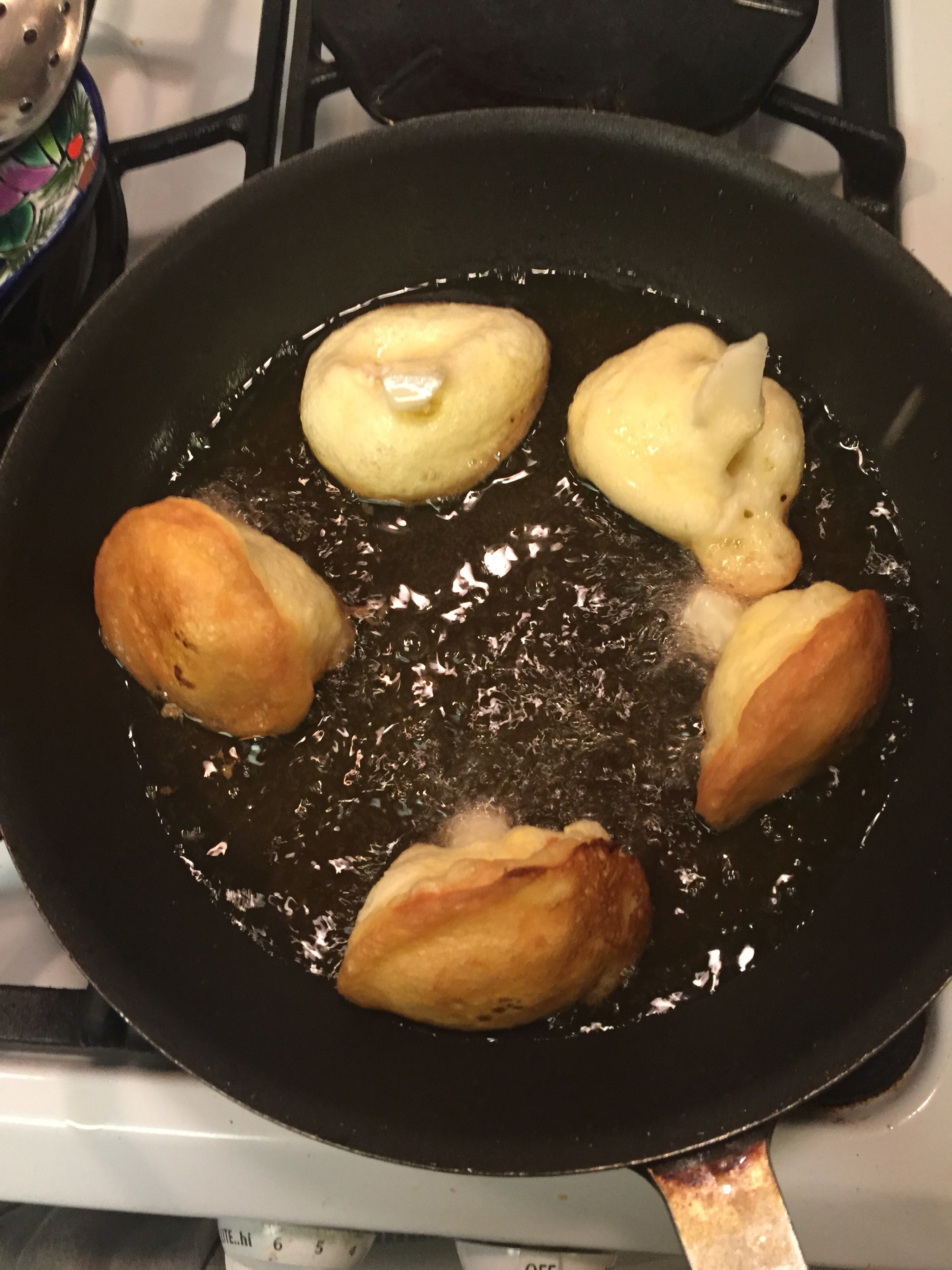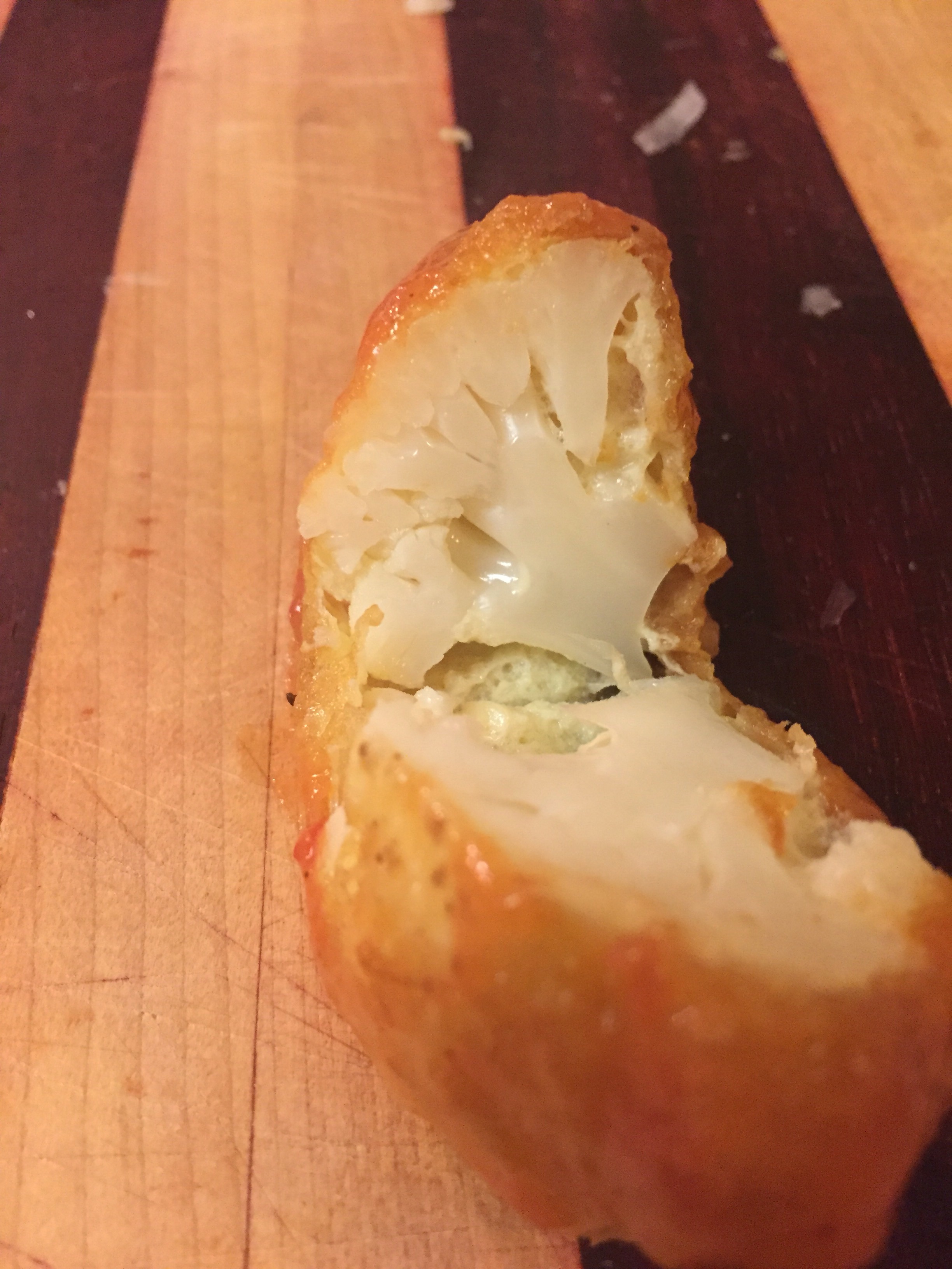 Pour oil in a small sauté pan. There should be about a half-inch of oil in the pan. Heat over high heat. When hot, dip florets in the egg batter till covered and drop them in the pan. You’ll need to do several batches but they brown pretty quickly. Spoon oil over the florets as they brown on the first side, then turn them all over and brown on the other side.